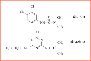 Chemical structures of the herbicides diuron (3-(3,4-dichlorophenyl)-1,1-dimethylurea) and atrazine (2-ethylamino-4-chloro-6-isopropylamino-1,3,5-triazine). |