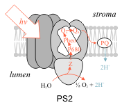Fig. 1. A schematic model of two grana connected by a single stromal thylakoid. Image from Garab and Mustárdy, 1999. Photosynthesis of green plants occurs in special organelles inside the plant cells called chloroplasts. The chloroplasts have double outer envelope and an inner system of interconnected membrane vesicles called thylakoids. They are usually arranged in stacks called grana (Fig. 1). All thylakoids constitute the thylakoid membrane, which divides the chloroplast into two separate volumes — the intrathylakoid space (lumen) and the surrounding stroma. The first phase of the photosynthetic process — the light reactions, which transform the light energy into chemical energy in the form of high-energy bonds of ATP and reduced NAPDH — takes place on the thylakoid membrane. The second phase — the dark reactions, which use the energy stored by the light reactions to convert CO2 into carbohydrates — occurs in the stroma. The thylakoid membrane holds four transmembrane protein supercomplexes, namely Photosystem 1, Photosystem 2, the Cytochrome b6f complex, and the ATP-synthase. The photosystems are pigment-protein complexes containing chlorophyll. The chlorophyll molecules in their antennae trap the light quanta and drive an electron-transport chain which creates a difference between the proton concentration on both sides of the thylakoid membrane. This proton gradient is used by the ATP-synthase to convert ADP into the high-energy compound ATP. Fig. 2. represents the linear electron transport in the thylakoid membrane according to the presently-accepted Z-scheme. The Photosystem 2 antenna delivers the light energy to a special chlorophyll — the PS2 reaction centre chlorophyll (P680). Upon excitation, it can donate an electron to the primary acceptor, pheophytin. The redox potential energy drives the electron further down the electron-transport chain — QA, QB, PQ, Cyt. b6f, PC, and PS1. The energy freed during this electron transport is used to transfer a proton from the stroma into the lumen. Thus, the proton gradient is generated. The protons accumulated in the lumen of the thylakoid membrane pass through the ATP-synthase and generate ATP, which is the energetic currency of the living organisms. ATP's energy drives virtually all other energy-dependent processes in living organisms other than the primary processes of photosynthesis. Upon arrival at the PS1 donor-side, the electron has lost its redox potential energy and another light quantum is needed for the PS1 reaction centre to push the electron further to the rest of the electron carriers. Finally, the electron is transfered to NADP and used in the dark phase of photosynthesis to reduce CO2. Overall, the electrons in photosynthesis pass from Photosystem 2 via Cytochrome b6f and Photosystem 1 to NADP and carbohydrates. Photosystem 2 replenishes its lost electrons by splitting water. The water-splitting reaction yields, in addition to electrons, protons (which add to the proton gradient) and free oxygen that we can breathe, and is in fact the most energy-consuming reaction in the biosphere. |