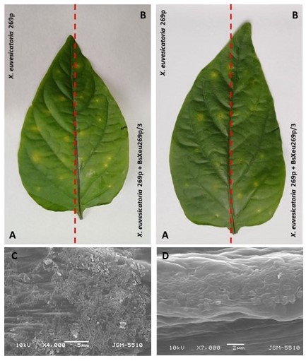 Ефект от прилагането на изолирания в България литичен бактериофаг BsXeu269р/3 върху растения пипер (Capsicum annuum L.), заразени с Xanthomonas euvesicatoria 269p. (А) Хлоротични петна върху листа на растения пипер (Capsicum annuum L., сорт Софийска капия), инокулирани с Xanthomonas euvesicatoria 269p чрез точково заразяване; (В) Намаляване на видимите симптоми в същия лист след третиране с BsXeu269p/3, 11 дни след заразяването; (C) Eпифитна колония от Xanthomonas euvesicatoria 269p по долната повърхност на лист от пипер, седем дни след заразяването; (D) Потенциалния бактериолитичен ефект на BsXeu269p/3 към същата бактерия в растителни проби. Снимки (C) и (D) са направени на сканиращ електронен микроскоп.